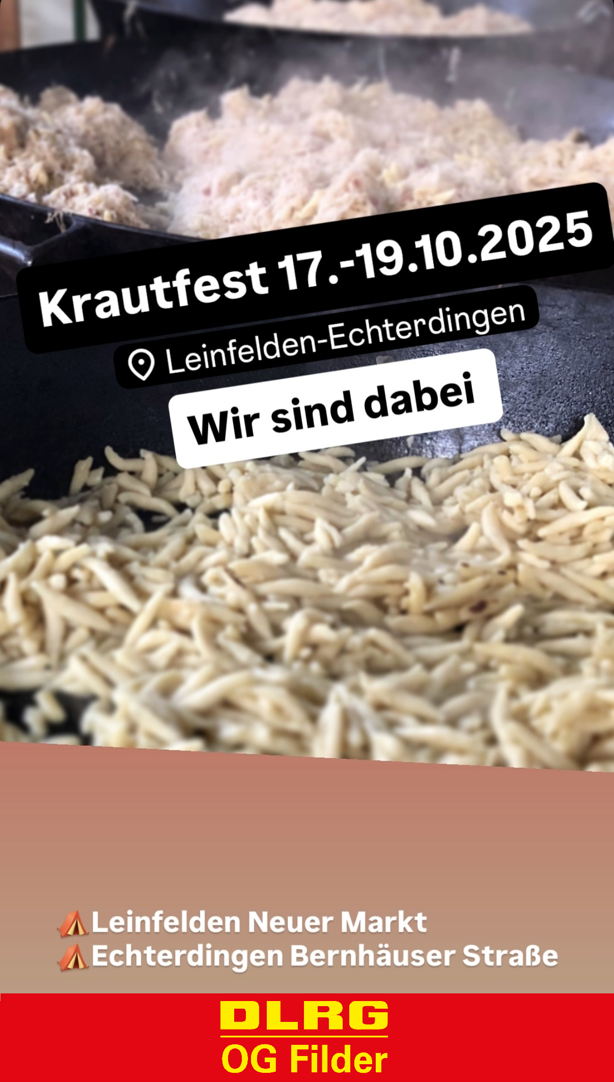Besucht uns auf dem Filderkrautfest in Leinfelden-Echterdingen. Die DLRG OG Filder ist wieder mit zwei Verpflegungsständen auf dem Krautfest vertreten. In Echterdingen bieten wir aus drei großen Pfannen unser echtes Filderkraut mit Schupfnudeln an. Seit vergangenem Jahr bieten wir auch eine vegetarische Variante an.
