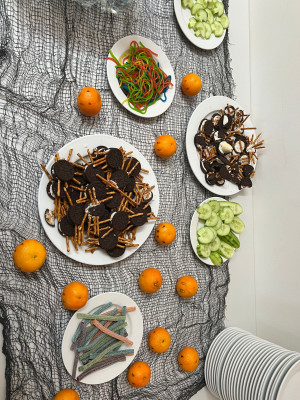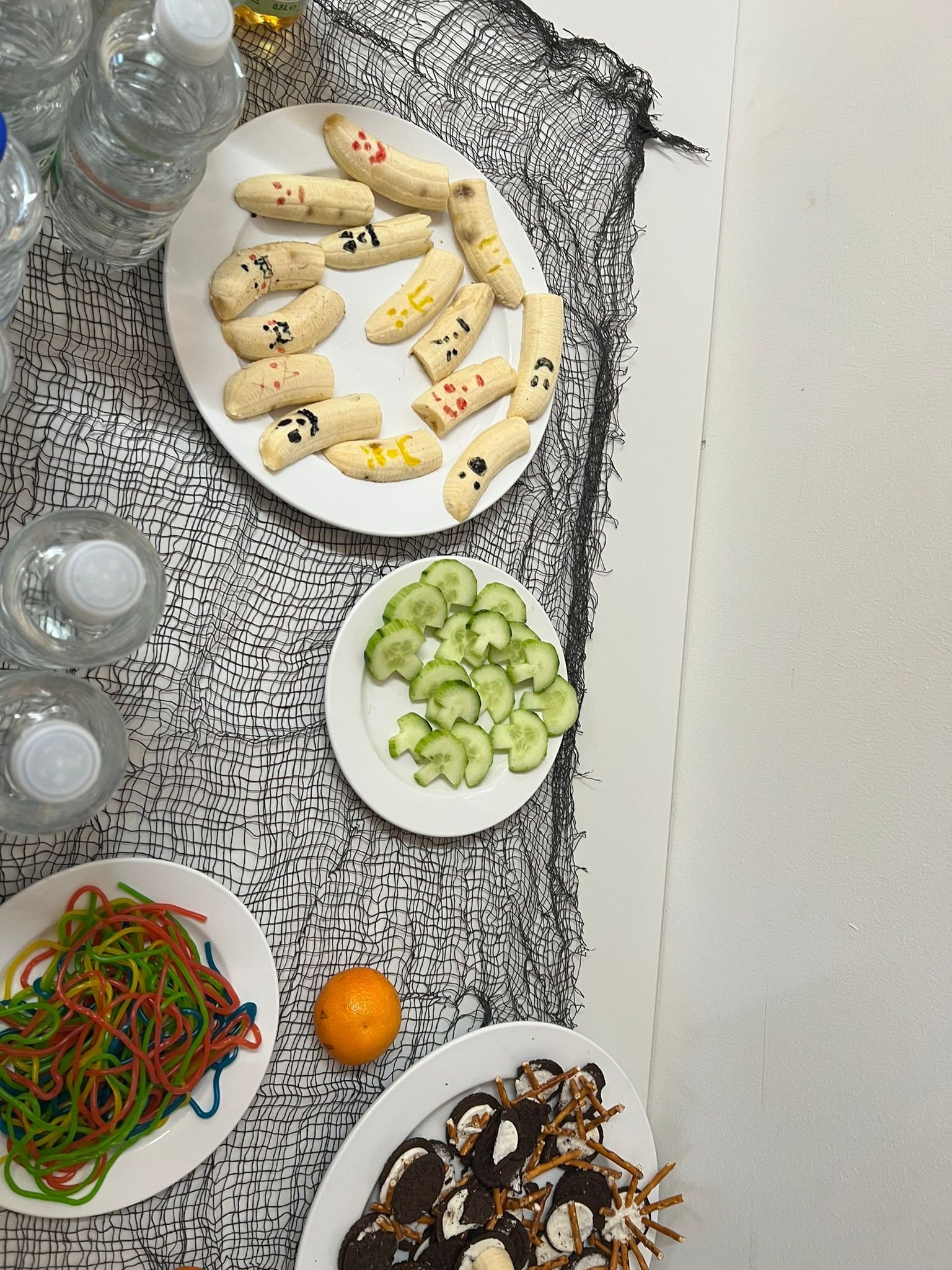 Ein besonderes Highlight war das gruselige Buffet, das gemeinsam gestaltet wurde. Neben vielen thematisch passenden Leckereien waren die beliebten Spinnen-Kekse ein echter Hingucker und geschmacklicher Erfolg. Das vielfältige Buffet bot süße und herzhafte Snacks, die allen Teilnehmenden große Freude bereiteten.